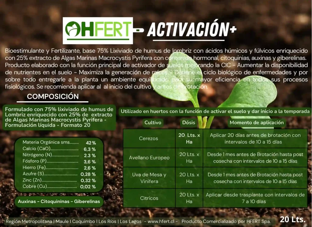 Hfert-suelo es un biofertilizante y a su misma vez biomejorador de suelo compuesto por diferentes nutrientes, ácidos húmicos, ácidos fúlvicos, bacterias y hongos benéficos que en su conjunto forman la base para nuestra línea radicular. potenciadas con nutrientes dentro de una solución líquida y estable, los cuales, utilizándolos a través de sistemas de fertiirrigación en los diferentes estados fenológicos de la planta, se llega a obtener resultados que cumplen con los mejores estándares de calidad que exige hoy en día los mercados nacionales e internacionales.